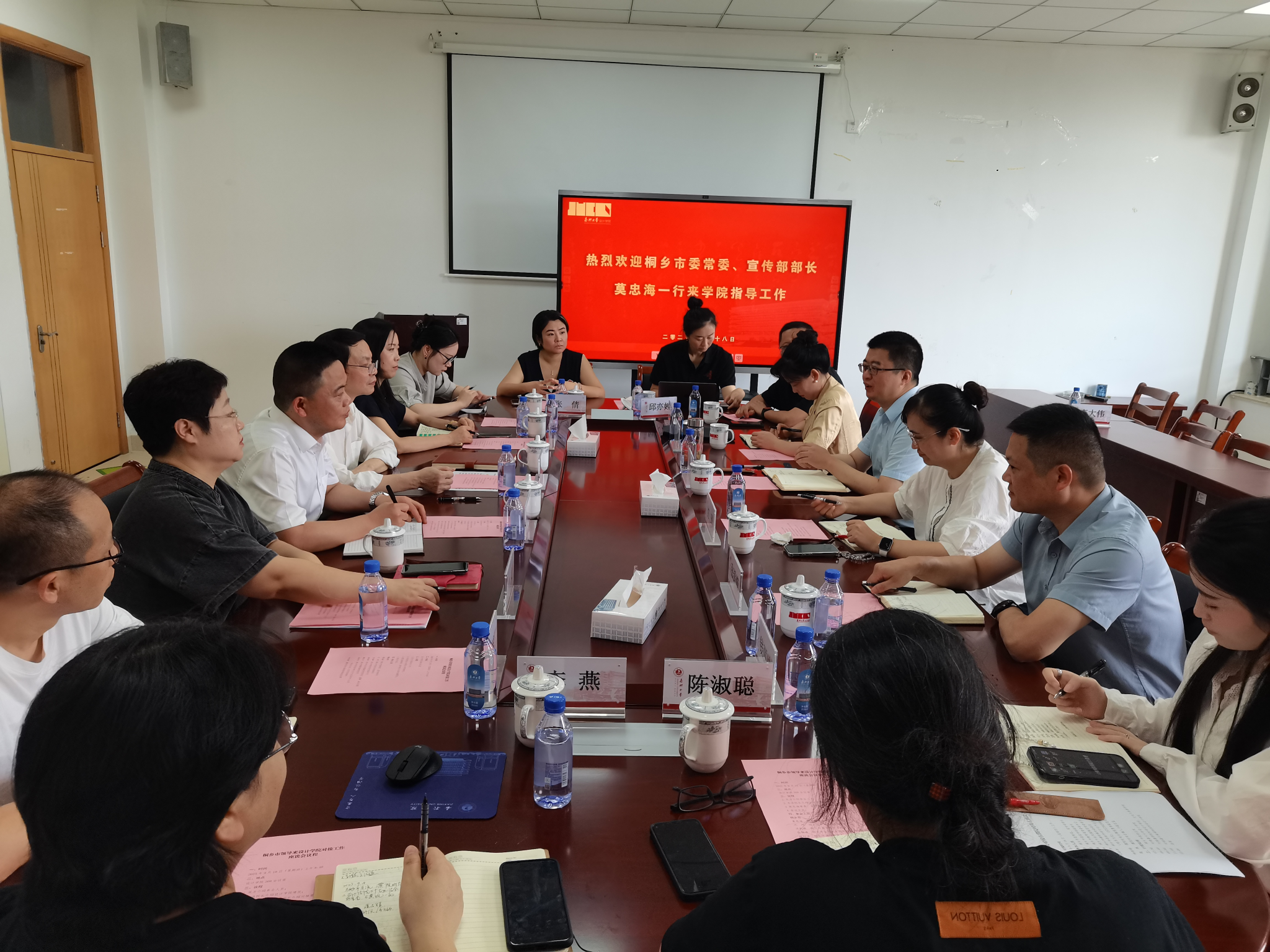 2025年9月18日上午,桐乡市委常委、宣传部部长莫忠海率队莅临嘉兴大学设计学院,就濮院时尚古镇校地合作基地建设开展专项对接。桐乡市委宣传部副部长沈琦,市教育局党委副书记沈利敏,金凤凰集团党委委员、董事、副总经理张锡峰,濮院镇党委委员魏衍方,学院党政班子成员及相关专业负责人、系主任等参加座谈研讨。